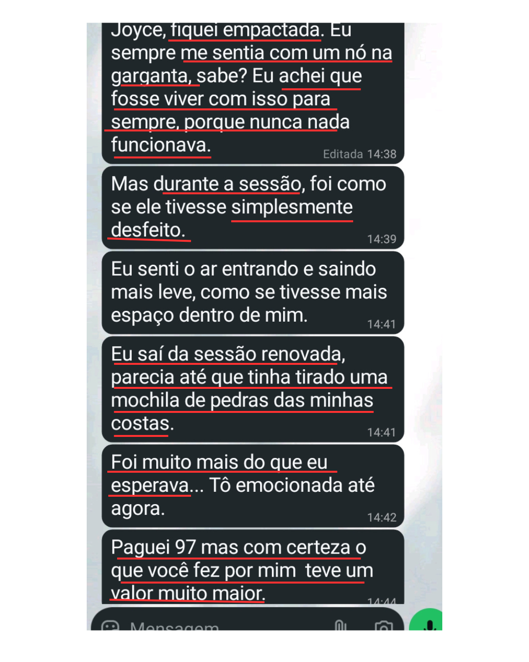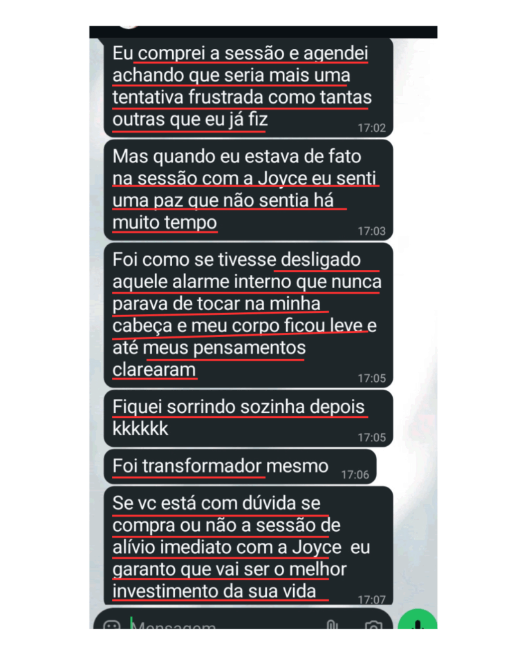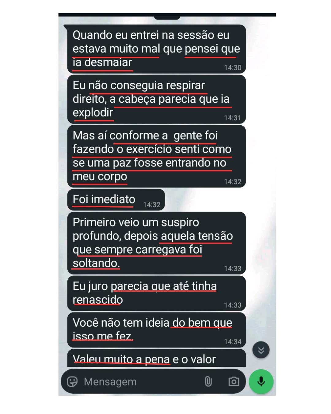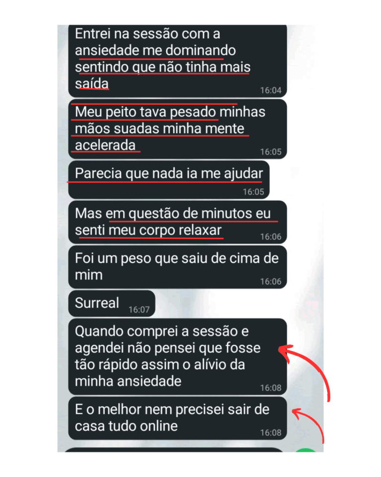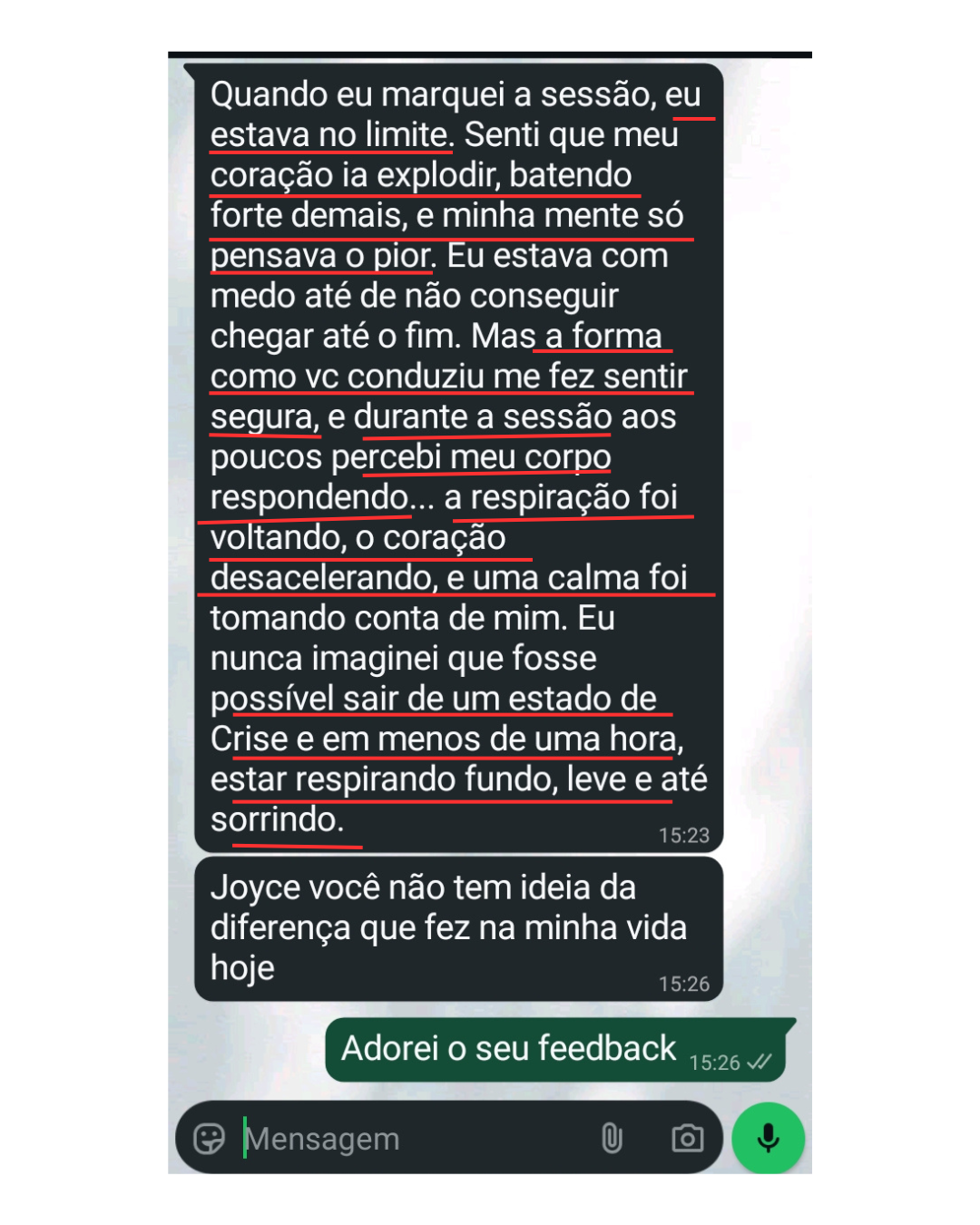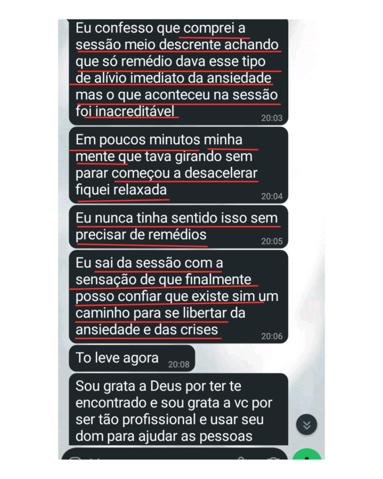 Nesta etapa, aplico técnicas comprovadas que atuam diretamente no alívio imediato dos sintomas da ansiedade. Você vai sentir seu corpo desacelerando, sua mente voltando ao equilíbrio e uma sensação de calma tomando conta. Esse é o objetivo da sessão: trazer o alívio que você precisa a tanto tempo.