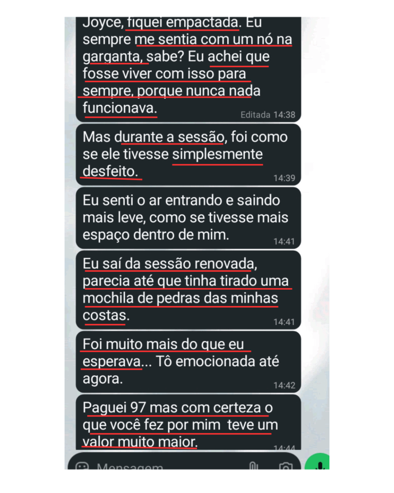 Nesta primeira parte da sessão, você vai poder tirar o peso do peito e falar com liberdade sobre o que tem vivido. Aqui, a ansiedade não é tratada como frescura ou exagero. É tratada com acolhimento, escuta e respeito. Você vai poder compartilhar seus sintomas, seus pensamentos acelerados, seus medos e suas angústias. É o início do fim da ansiedade que você carrega sozinha(o).